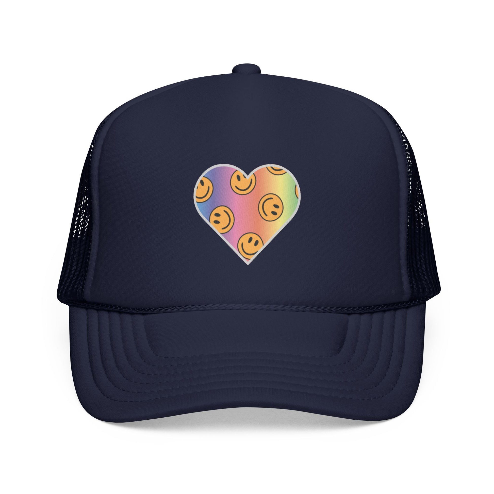 A bright, playful trucker cap that brings a splash of retro joy to everyday wear. Soft foam front and breathable mesh back keep you cool while the colorful printed heart—filled with smiling emoji faces—adds a wink of nostalgia and upbeat personality. The adjustable snap closure and one-size design make it easy to wear during long days out, weekend markets, or casual meetups with friends. The dye-matched details and crisp printing keep the look cohesive and lively. Let this cap do the talking when you want something cheerful, confident, and slightly ironic on your head.